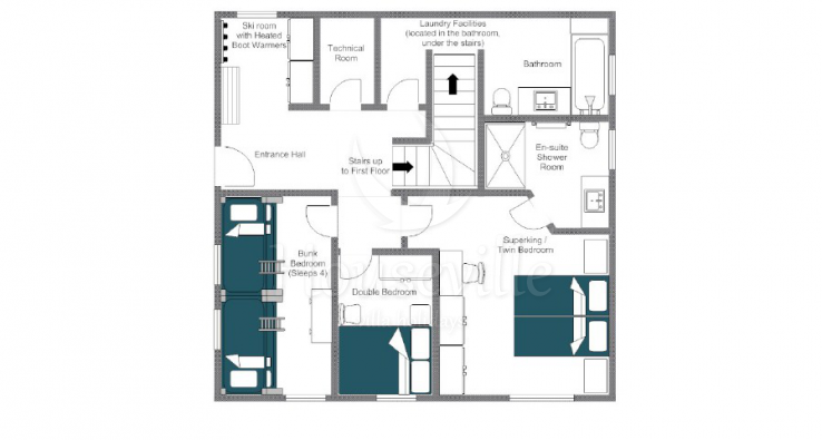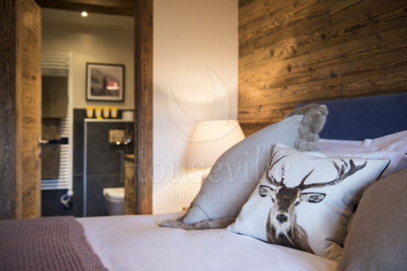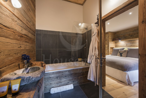 - Гости заходят в шале и попадают на нижний уровень. Здесь находится вместительная комната для снаряжения с сушилками для обуви и 3 спальни: большая спальня №1 с двуспальной кроватью и прилегающей душевой комнатой, красивая спальня №2 с двуспальной кроватью, оформленная в альпийском стиле и уютная спальня №3 с двухъярусной кроватью, прекрасно подходящая для детей. На уровне также имеется большая ванная комната.