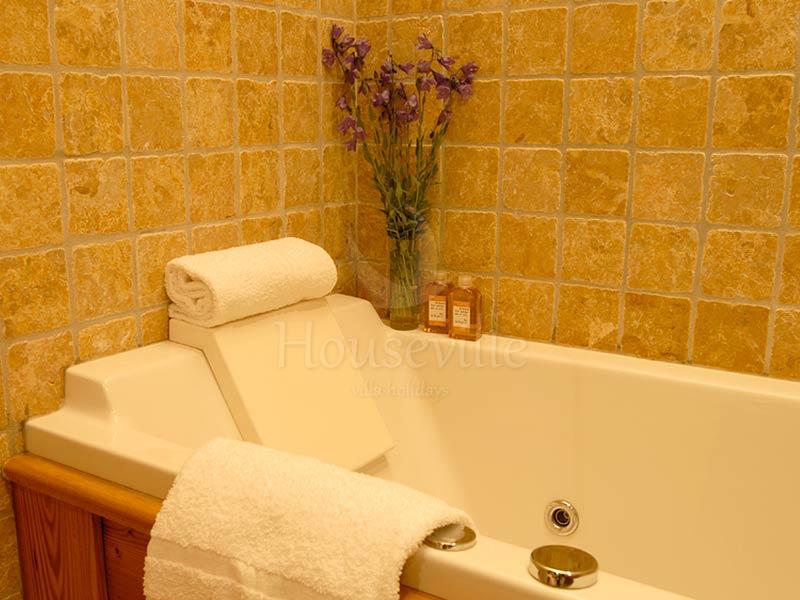 - Спальня №1: двуспальная кровать, прилегающая ванная комната с массажной ванной, раковиной и туалетом. Есть место для детской кроватки;