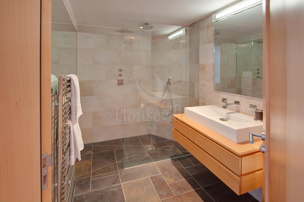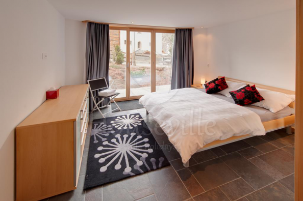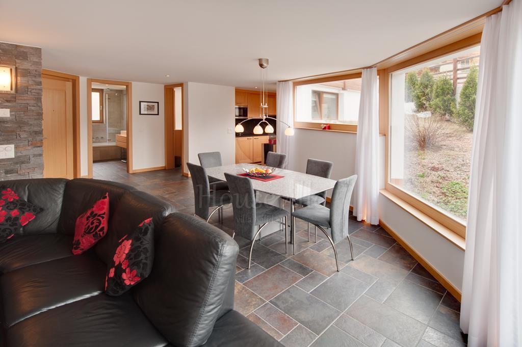 Эти стильные апартаменты с 2 спальнями находятся на основном уровне замечательного шале. В распоряжении гостей большая спальня с двуспальной кроватью, террасой и прилегающей ванной комнатой, а также спальня с 2 односпальными кроватями и приватной ванной комнатой (ванна, душ, туалет). В каждой ванной комнате установлены полотенцесушители. Современная кухня оборудована гранитными рабочими поверхностями, плитой, духовкой, микроволновой печкой, посудомоечной машиной, тостером, чайником и холодильником с отдельной морозильной камерой. Здесь достаточно вместительных шкафчиков. Кухня оснащена качественными кухонными принадлежностями, есть достаточное количество посуды. Имеется очень большая столовая открытой планировки и лаунж со стеклянными дверями, ведущими на террасу с видами на гору Маттерхорн. В лаунже установлен большой телевизор с кабельным и SKY-ТВ, система объемного звучания, DVD и CD-проигрыватель. Большой обеденный стол рассчитан на 6 персон.