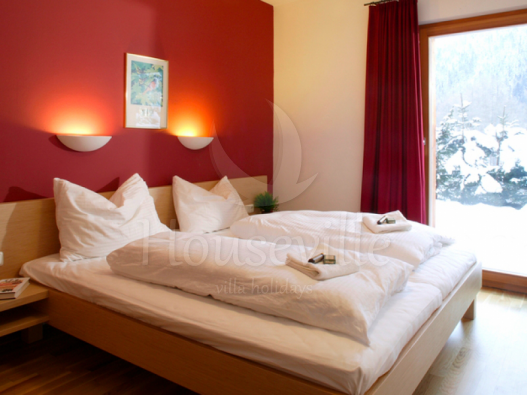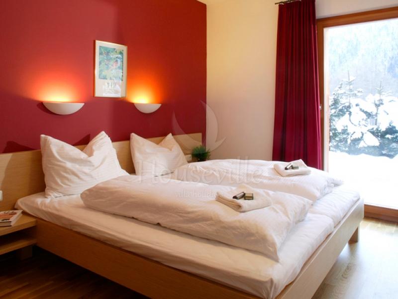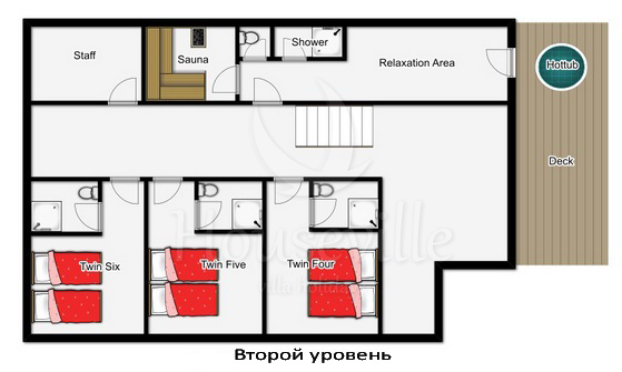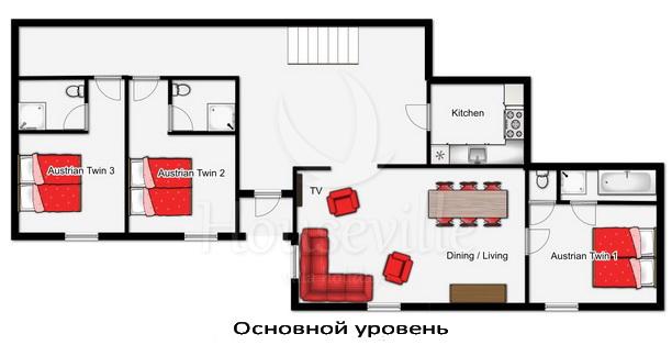 На основном уровне находится вход, холл, гостиная/столовая открытой планировки, а также Спальни №1 с 2 односпальными кроватями и ванной комнатой (ванна, раковина и туалет). Этот уровень вмещает в себя Спальни №2 и №3 с 2 односпальными кроватями и ванной комнатой (душ, раковина, туалет). Спальни выполнены в австрийском стиле. На втором уровне располагаются спальни №4-6 с 2 односпальными кроватями и ванной комнатой (душ, раковина, туалет), а также сауна и зона для отдыха с выходом к террасе с джакузи.