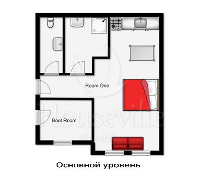 - Основной уровень: общий вход Спальня №1, которая представляет собой отдельную студию с двуспальной софой и дополнительной односпальной софой, прилегающим душем с раковиной и отдельным туалетом;