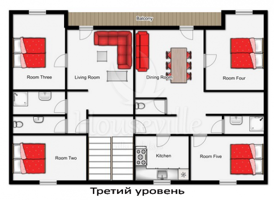 - Третий уровень: гостиная, столовая, кухня, 2 душевые комнаты с раковиной, 2 туалета, 4 спальни в австрийском стиле, из них Спальня №3 находится возле гостиной, а Спальня №4 расположена возле столовой.