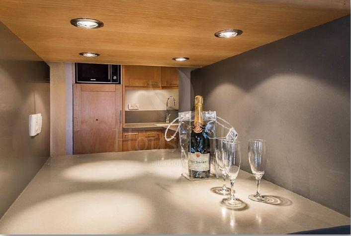 Эти уютные апартаменты (60 кв. м) с 2 спальнями рассчитаны на 5 человек. Они находятся на 6 уровне комплекса, в 50 метрах от склонов и 230 метрах от центра. Здесь есть гостиная зона с софой и телевизором, обеденная зона, полностью оборудованная кухня открытой планировки и обращенный на юго-запад балкон с видом на горы. В Спальне №1 установлена двуспальная кровать, а в спальне №2 есть 1 двухъярусная кровать и 1 односпальная кровать. Имеется 1 душевая комната и отдельные туалеты.