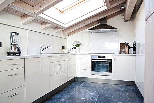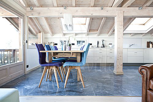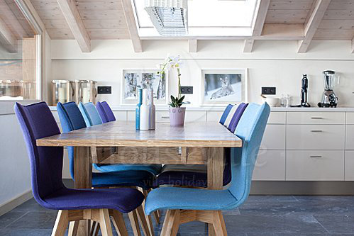 Верхний уровень располагает очень светлым пространством с окнами на три стороны. Эта площадь была разделена на три условные зоны: гостиная, столовая и кухня. Кухня оснащена всей необходимой бытовой техникой, включая кофе-машину. Столовая вмещает в себя 8 посадочных мест, а гостиная располагает уютной зоной вокруг дровяной печи и выходом на балкон. Вторая дверь ведет на обеденную террасу, откуда открывается прекрасный вид на знаменитый МонБлан.