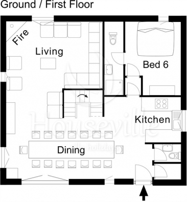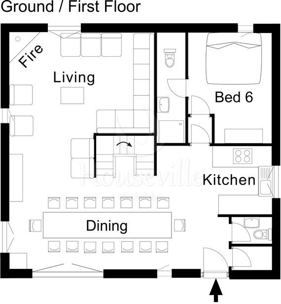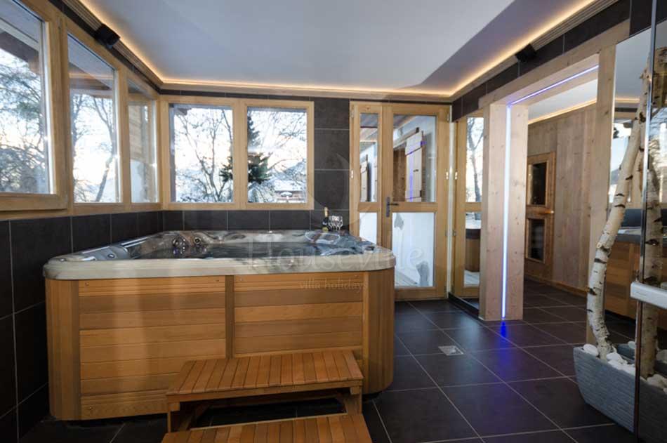 Шале занимает 3 уровня. Вход находится на основном уровне. Здесь расположен просторный холл, большая гостиная и обеденная зона открытой планировки. В гостиной есть отделанный камнем камин, большой телевизор, DVD-проигрыватель и Freeview-ТВ, комната обставлена софами и стульями. На этом уровне расположена 1 спальня с прилегающей ванной комнатой. По лестнице можно спуститься на нижний уровень с 2 спальнями с прилегающими ванными комнатами. Этот уровень также вмещает в себя комнату для снаряжения с подогревом для обуви, спа-центр с горячей купелью, парной и сауной. Этот уровень имеет отдельный вход, которым можно воспользоваться, вернувшись с лыжных трасс. На второй уровень ведет красивая лестница из старого дерева. Здесь расположены 5 спален. Две из них формируют удобный семейный сьют с общей душевой комнатой, тогда как другие 3 спальни имеют приватные ванные комнаты.