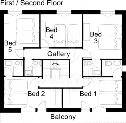 - Спальня №4 и №5: по 2 односпальные кровати в каждой, общая душевая комната с раковиной и туалетом;