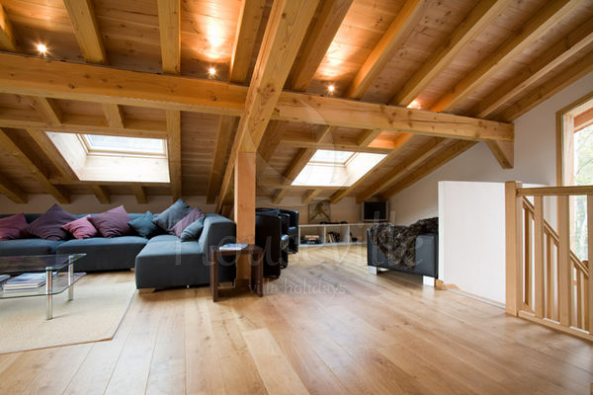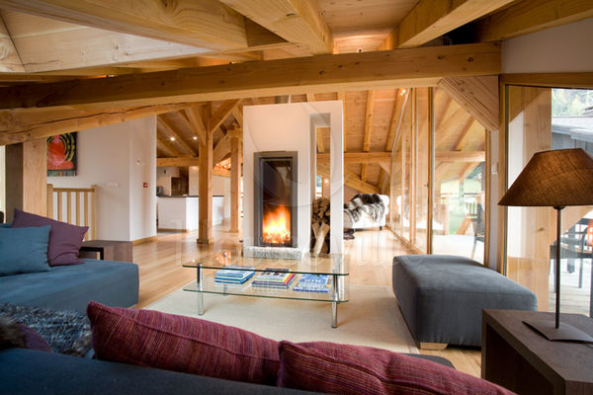 - На втором уровне находится просторная и светлая гостиная/обеденная зона со скандинавским камином, большим обеденным столом, комфортной софой, ТВ-зоной и двусветным потолком с деревянными балками. Уровень также включает в себя полностью оборудованную кухню и балкон с красивым видом.