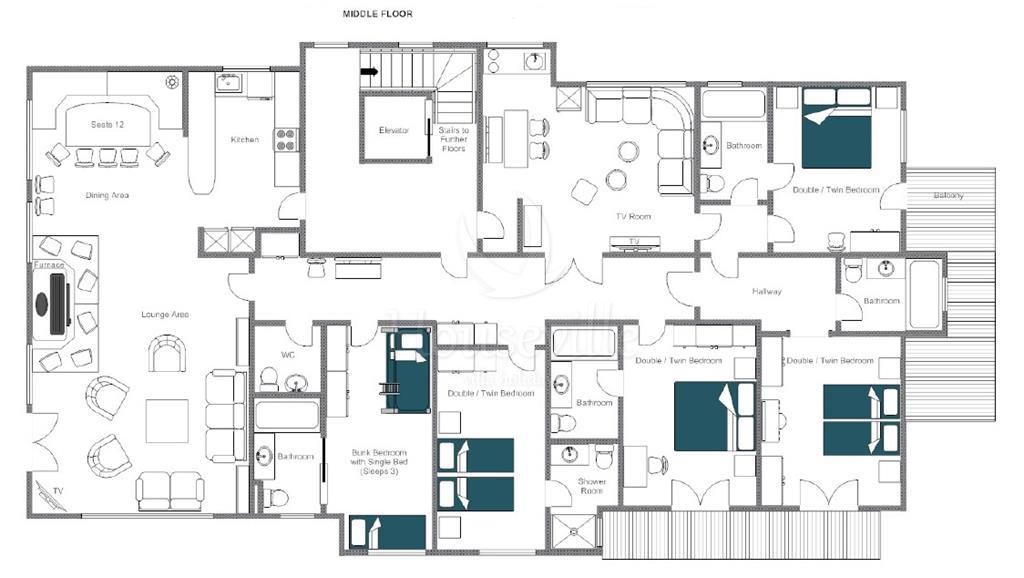Апартаменты занимают 1 (средний) уровень и включают в себя 1 главную спальню с двуспальной кроватью и прилегающей ванной комнатой, 2 спальни с 2 односпальными/двуспальной кроватью и прилегающими ванными комнатами, 1 спальню с 2 односпальными кроватями и прилегающей душевой комнатой, 1 спальню с двухъярусной кроватью и 1 односпальной кроватью, к спальне прилегает ванная комната. Имеется отдельный туалет. Есть кухня, столовая и гостиная.