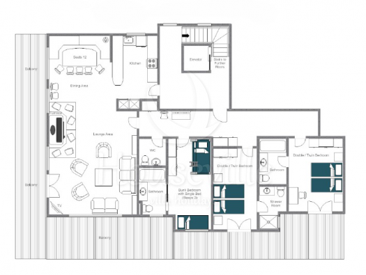 Апартаменты занимают 1 уровень и включают в себя: 1 двуспальную, 1 спальню с 2 односпальными/двуспальной кроватью и 1 спальню с двухъярусной и 1 односпальной кроватью. Каждая спальня имеет прилегающую ванную комнату. Есть кухня/гостиная/столовая открытой планировки и гостевой туалет.