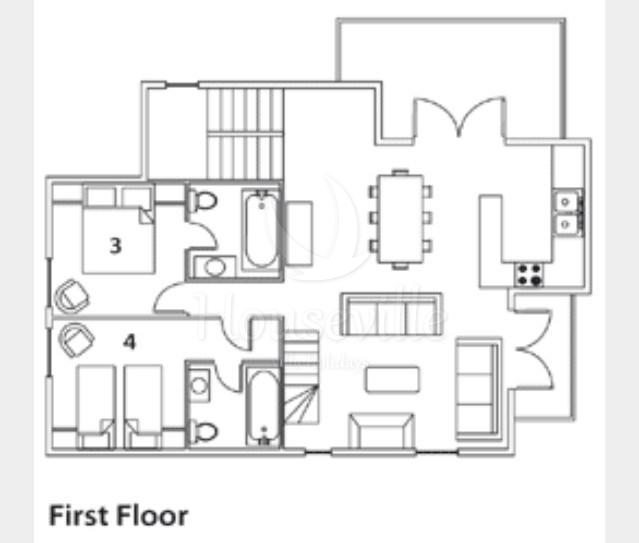 - Спальня №4: 2 односпальные кровати, прилегающая ванная комната с раковиной и туалетом. На мезонине есть место для временного размещения дополнительной кровати.