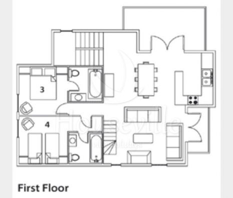 - Спальня №3: двуспальная кровать, прилегающая ванная комната с раковиной и туалетом;