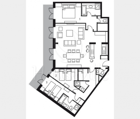 - Спальня №3: двухъярусная кровать, прилегающая ванная комната (ванна, душ и туалет), место для детской кроватки.