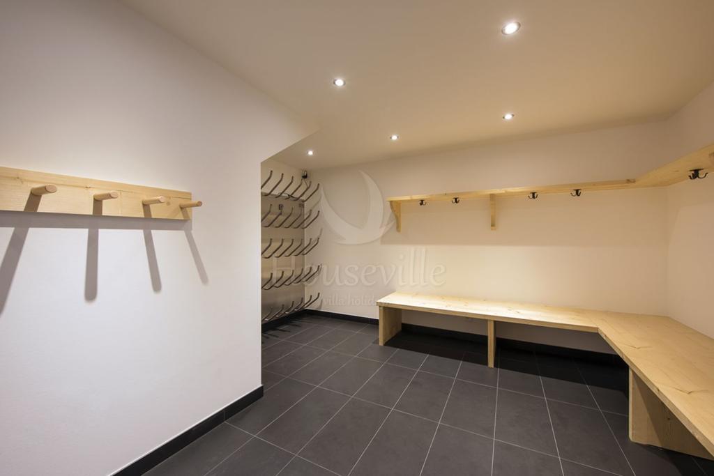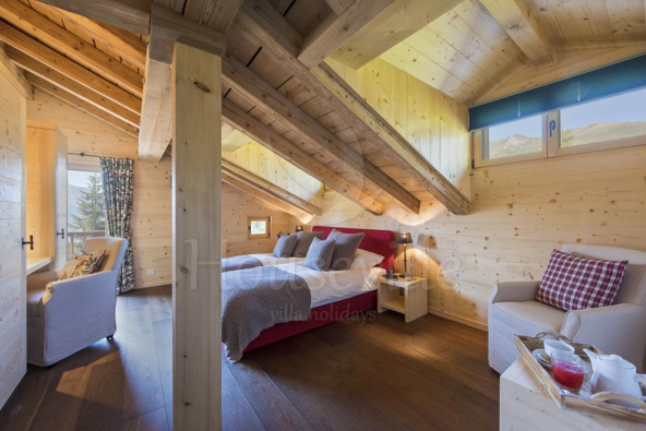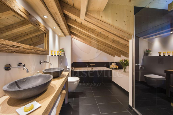 - Верхний уровень: вход в шале, комната для снаряжения с сушилками для обуви, гараж (не доступен зимой), гостевой туалет, 1 спальня с 2 односпальными/двуспальной кроватью, балконом, прилегающей ванной комнатой и отдельным душем. Также этот уровень вмещает в себя 1 спальню с 2 односпальными/двуспальной кроватью, балконом и прилегающей ванной комнатой;