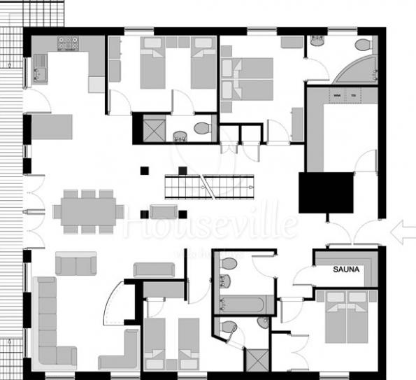 - В спальне №1, №2 и №3 установлена большая двуспальная кровать/2 односпальные кровати, к каждой спальне прилегает ванная комната;