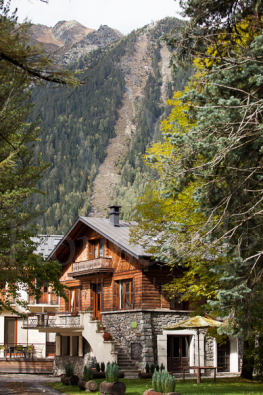 Это большое шале расположено в центре Шамони, возле кабельного подъемника Эгюй-дю-Миди (Aiguille du Midi), близко к барам и ресторанам. Шале окружено садом размером 1 300 кв. м. Летом в саду можно загорать и готовить барбекю, а зимой играть в снежки, лепить снеговика и наслаждаться видом заснеженного Монблана и вершины Эгюй-дю-Миди. Шале можно арендовать полностью (группам до 30 человек), также оно делится на 4 апартамента, которые можно компоновать в зависимости от размера группы (до 10 человек). От ворот к основному зданию и флигелю ведет подъезд из 3 дорожек. Предусмотрена приватная крытая парковка для всех гостей. Всего в 250 метрах находится пешеходный центр Шамони. Зимой курсирует автобус для лыжников, который останавливается 2 минутах ходьбы от шале.